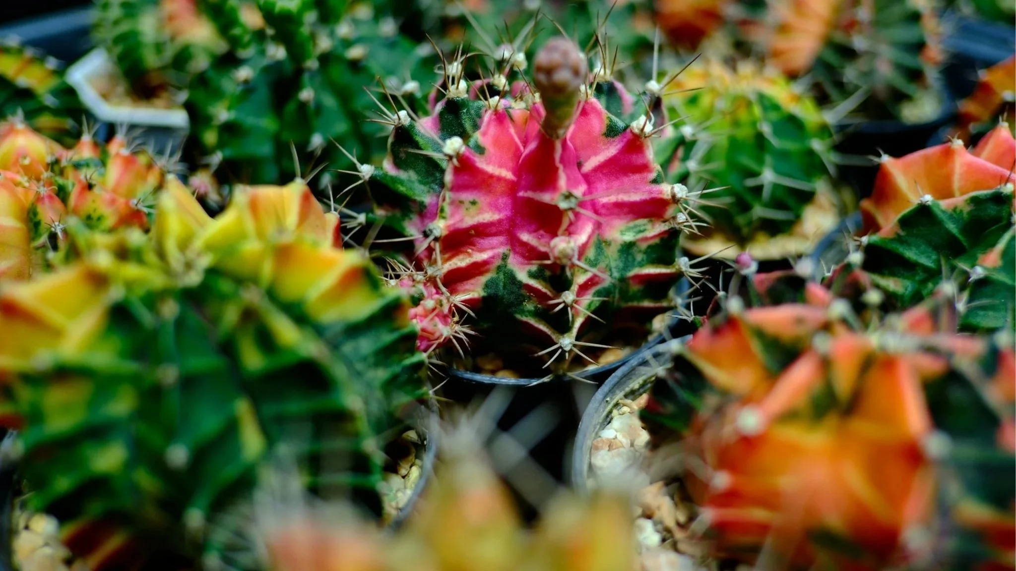[15:04] Plant number three is the variegated Gymocalycium, a globular cactus with a colour scheme that makes me think of creating tie-dye t-shirts back in brownies about a million years ago. If you love a cactus but you want something that looks a little bit different, this is a really great choice. If you can buy these in person so you can individually select a really good looking specimen because they do vary quite a lot so you're looking at custardy tones you're looking at orangey tones you're looking at sunset tones and magenta and of course green and each one is a work of art on its own every time I look at one of these I'm just filled with joy they're compact they're not going to take up a lot of room they need full sun do not play with these guys do not put them in a dark corner they will not like it and if you do give them enough light and a decent amount of water throughout the growing season so sort of april to october the colours will be enhanced by that good light the specific species we're talking about here is the Gymnocalycium mihanovichii, which is from South America, specifically Argentina and Paraguay. Bear in mind, this is a variegated cactus, so it's not able to photosynthesize as efficiently as a non-variegated one. So you'll need to bear that in mind in terms of growth rate, but they are just really beautiful plants. And even if they don't grow much, they just look gorgeous. It's worth saying that these are the same species as the cacti that are grafted as moon cactus the difference is that these are growing on their own roots and because they still contain areas of green they will still be able to grow without being on a graft so it's a much more sustainable way to grow this plant because those moon cacti i'm sorry but the grafts so often fail they're pretty short-lived really this is a more sustainable way of doing it so that the plants will grow on its own roots and should last for a good amount of time if you look after them well.